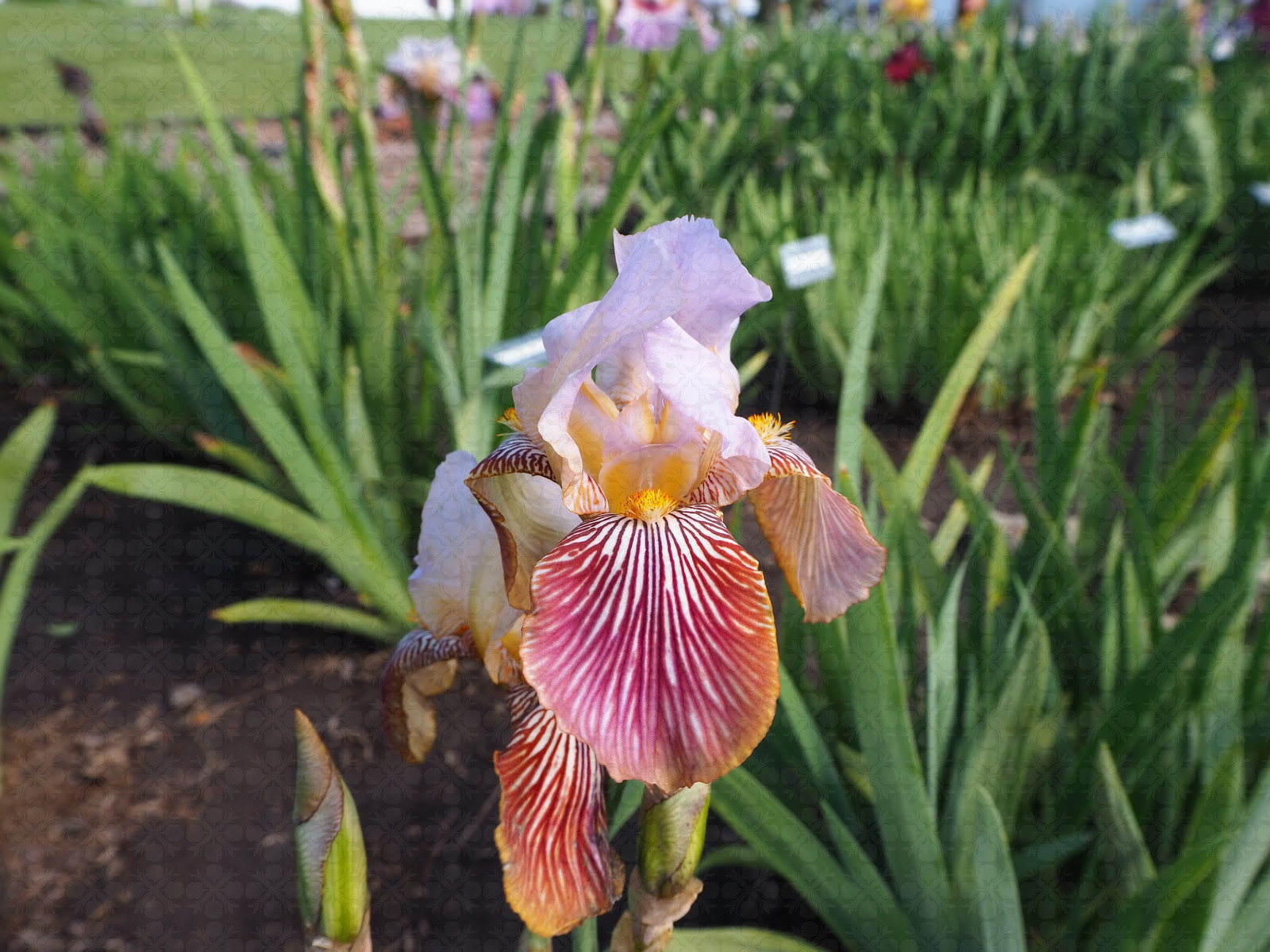 Descripton: Height 16-17″, S. lavender ice; F. same, center blaze circled with strong maroon veining, slight light rim; B. yellow.